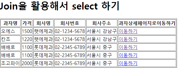 과자와 회사 정보 모두 가져오기 + 과자 하나 상세보기(join) (java)