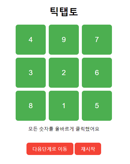 setMessage('모든 숫자를 올바르게 클릭했어요');