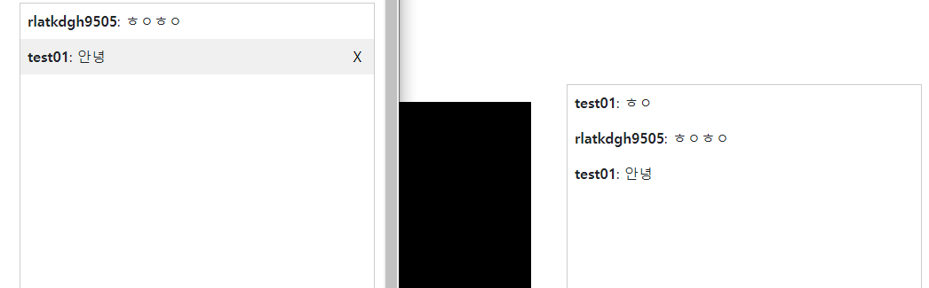 다음은 웹 페이지 2개를 띄워놓고 서로 다른 아이디로 로그인한 후 시현