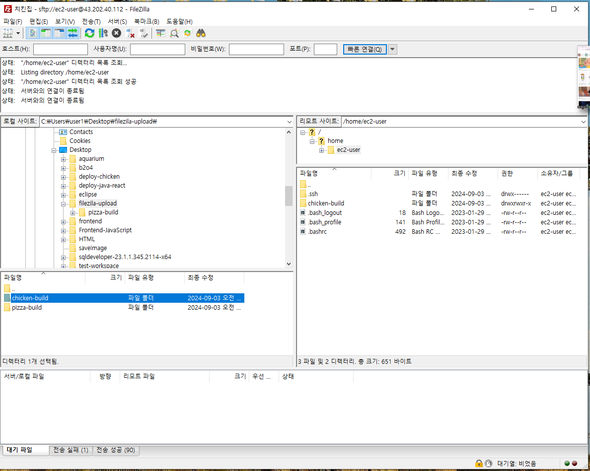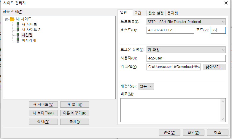 파일 - 사이트 관리자 - 새 사이트 - 프로토콜(SFTP) 설정 - 호스트(인스턴스에서 본 퍼블릭주소) - 포트(22)